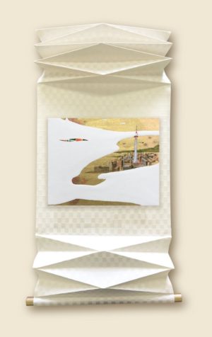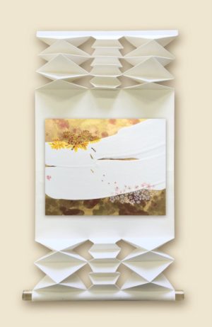 過去の時間が織り交ぜられたこの絵の中には、過去から引き継がれた時間を表現する為に、昔から引き継がれる友禅和紙が “粋” に配置されています。